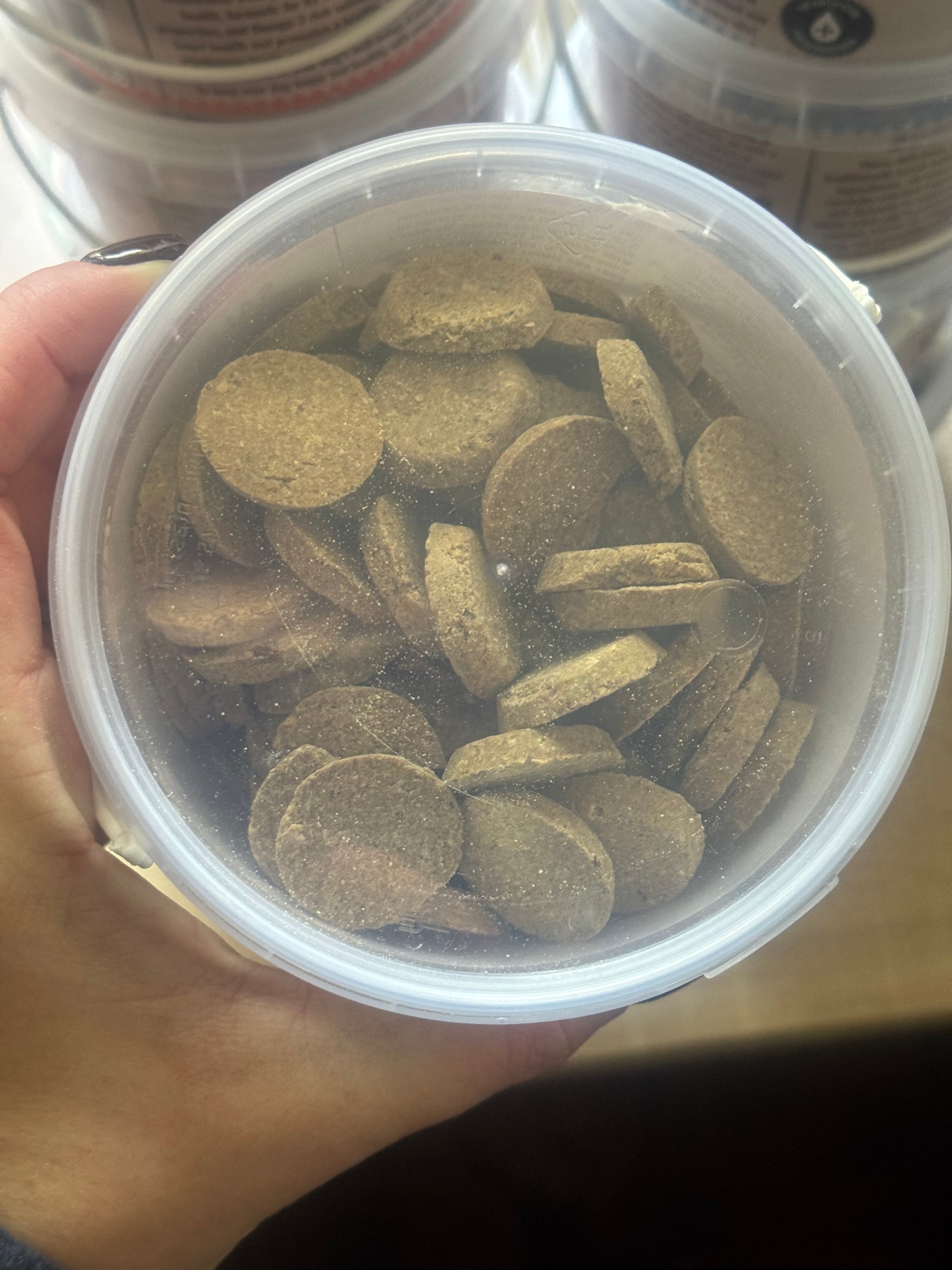 250g With salmon: 10% salmon meal, sweet potato, chickpea, water, pumpkin, rapeseed oil, salmon oil, turmeric, flaxseed, green lipped mussel, chondroitin, citric acidc glucosamine